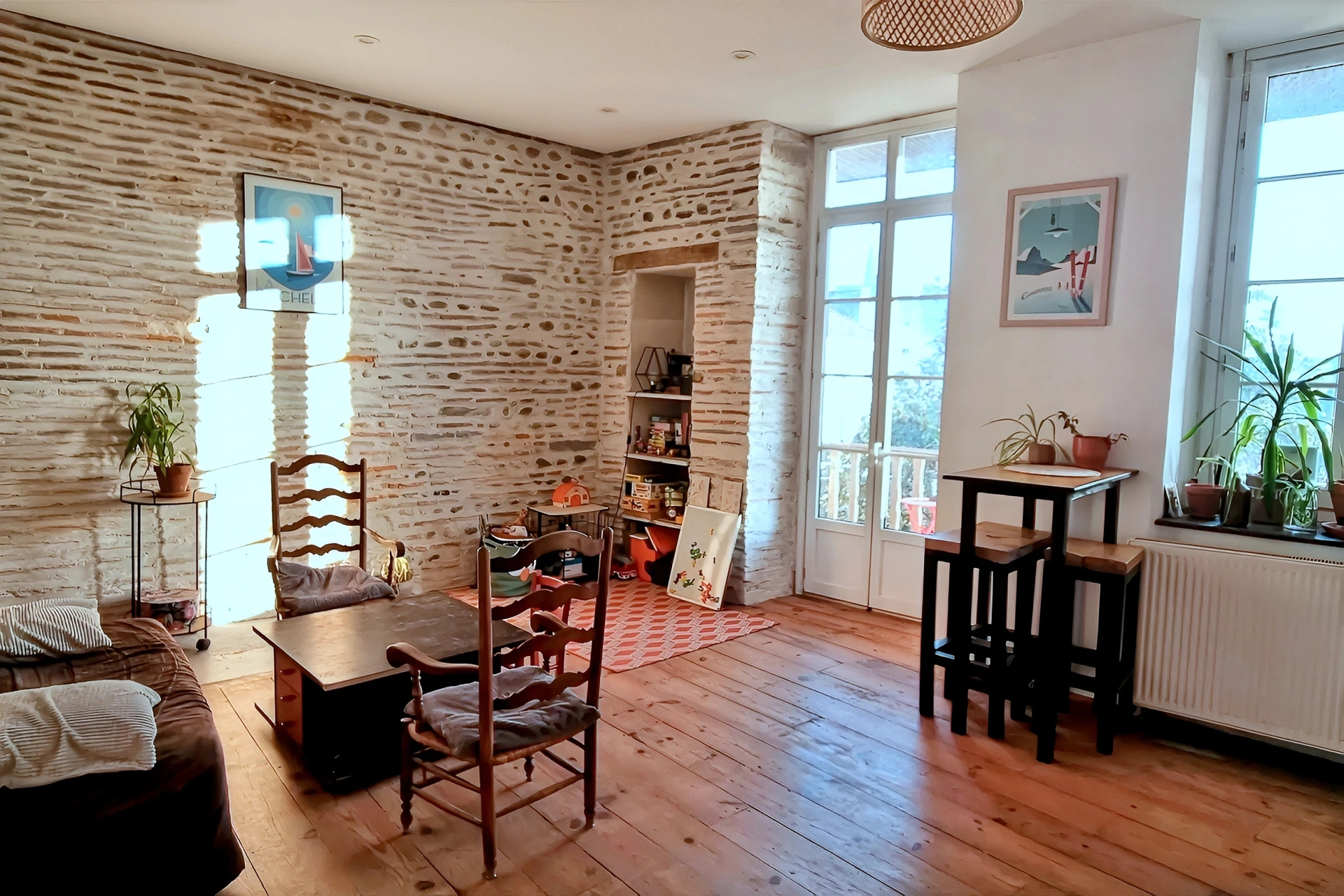 La pièce de vie de 35 m2, avec 3 mètres de hauteur sous plafond, pierres apparentes, poutres et plancher bois, offre un cachet rare et une atmosphère chaleureuse.