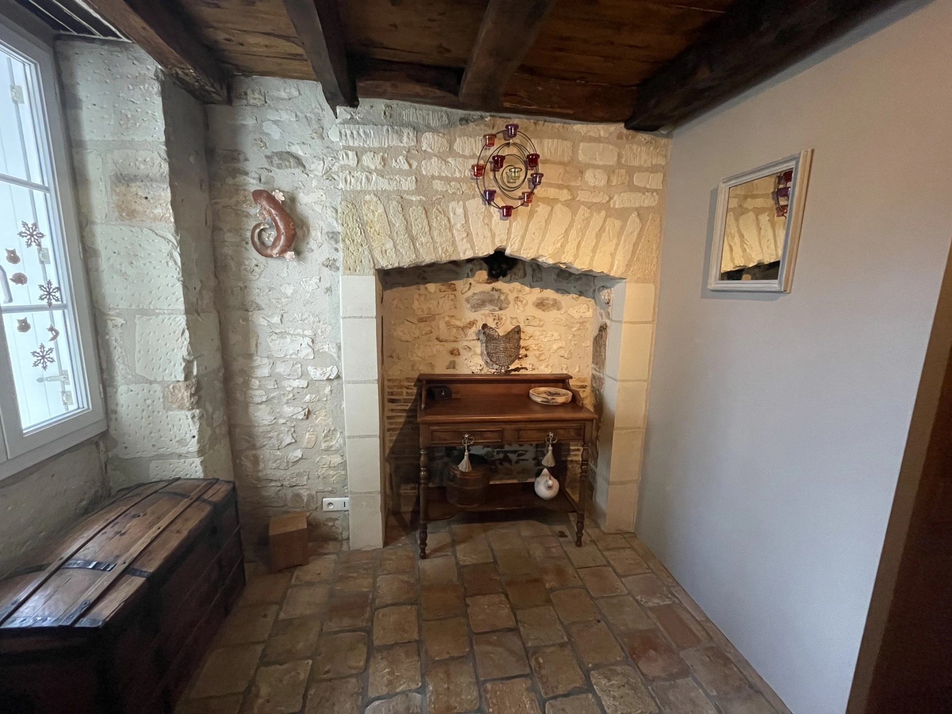 Dans cet environnement privilégié, la maison se dévoile avec élégance. Les pierres apparentes, le carrelage ancien et les détails d'époque donnent immédiatement le ton : ici, chaque espace raconte une histoire.