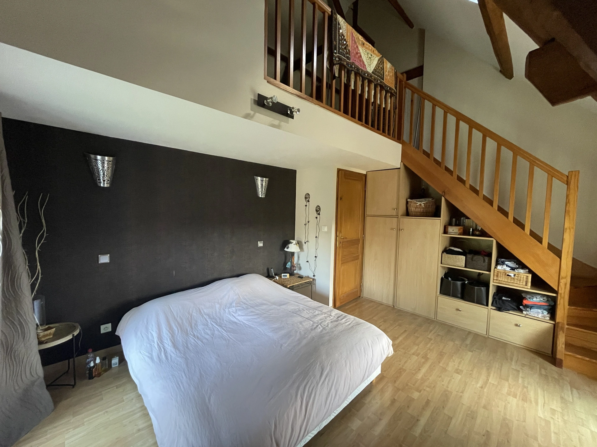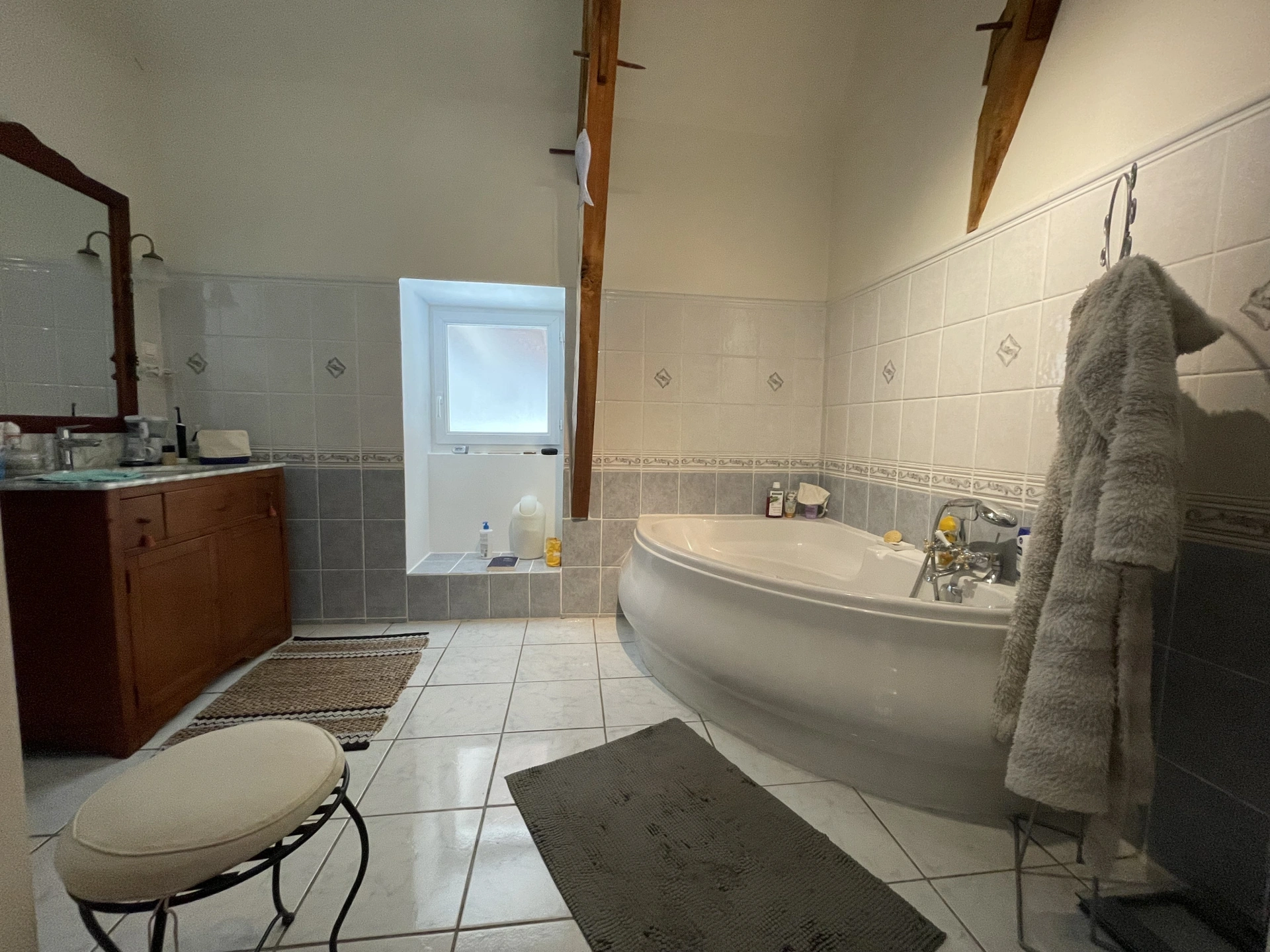 La maison offre quatre chambres, dont deux disposent de belles mezzanines, apportant à chacune une atmosphère unique et une belle impression d'espace. Les poutres apparentes mettent en valeur le cachet propre aux bâtisses de qualité, tandis qu'une salle de bain soigneusement aménagée, dotée d'une baignoire et d'une douche, ainsi que deux WC complètent l'ensemble. Le confort, lui, est assuré par une pompe à chaleur avec chaudière fioul en relève, offrant de belles performances énergétiques.