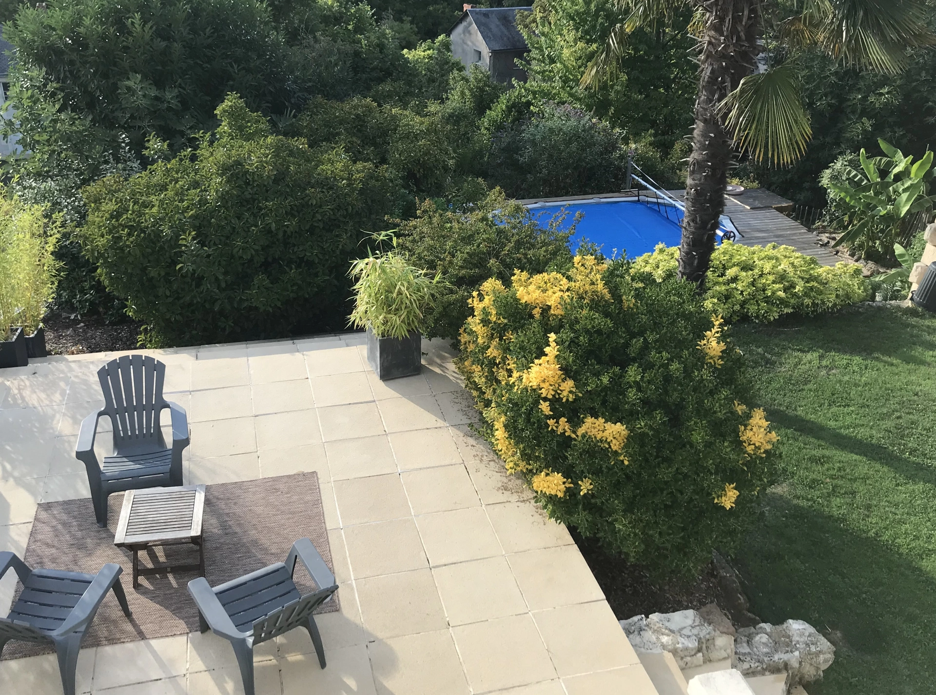 À l'extérieur, le décor est tout aussi séduisant. La propriété bénéficie d'un jardin soigneusement entretenu, sans aucun vis-à-vis, où la terrasse se mêle à une végétation méditerranéenne. La piscine s'intègre naturellement dans cet espace calme et chaleureux, créant un véritable lieu de détente.